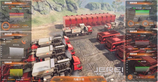 壓裂作業(yè)的復(fù)雜性決定了單一設(shè)備模擬無法滿足培訓(xùn)需求。捷瑞數(shù)字的油田設(shè)備模擬器通過“設(shè)備-井場-井下”三級聯(lián)動設(shè)計,實現(xiàn)了從地面設(shè)備操作到地下裂縫擴展的全鏈條仿真。