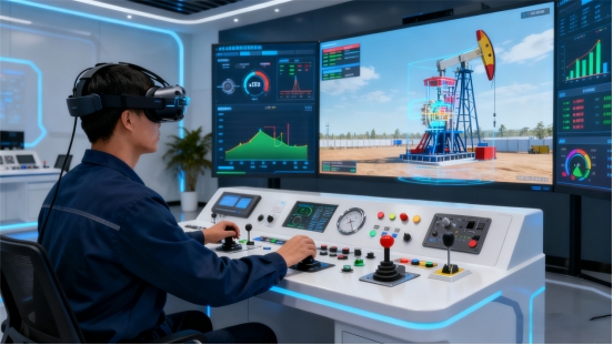 油氣開采虛擬仿真實(shí)訓(xùn)中心主要由硬件實(shí)物仿真與軟件虛擬仿真兩大部分協(xié)同構(gòu)建而成。在硬件方面,實(shí)訓(xùn)中心配備了按真實(shí)比例縮小或等比例還原的油氣開采核心裝備仿真模型,如鉆井機(jī)、采油樹、輸油管道等,這些模型不僅在外觀上與實(shí)物高度一致,更能模擬設(shè)備運(yùn)行時(shí)的機(jī)械動(dòng)作與操作反饋,讓學(xué)員獲得接近真實(shí)的操作觸感;軟件虛擬仿真則依托先進(jìn)的 3D 建模技術(shù)、虛擬現(xiàn)實(shí)(VR)技術(shù)與計(jì)算機(jī)仿真算法,構(gòu)建出完整的虛擬油氣田與井場(chǎng)場(chǎng)景。學(xué)員通過(guò)佩戴 VR 設(shè)備,可沉浸式進(jìn)入虛擬場(chǎng)景,直觀觀察油氣從勘探、鉆井、開采到輸送的全流程,還能與虛擬設(shè)備進(jìn)行交互操作,如模擬鉆井參數(shù)調(diào)整、設(shè)備故障排查等。硬件與軟件的深度融合,實(shí)現(xiàn)了對(duì)油氣開采全場(chǎng)景的精準(zhǔn)模擬,既規(guī)避了真實(shí)操作的風(fēng)險(xiǎn),又極大地提升了培訓(xùn)的靈活性與可重復(fù)性。