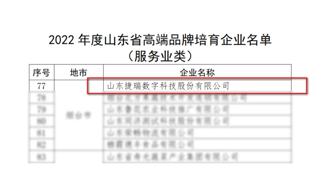 近日,山東省市場監管局、省發展改革委、省委宣傳部聯合發布2022年度山東省高端品牌培育企業名單,捷瑞數字榮耀上榜(服務業類)。