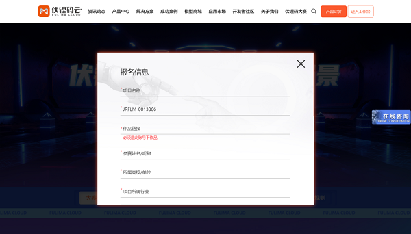 回到伏鋰碼大賽首頁,點(diǎn)擊【作品上傳】按鈕后,頁面將會(huì)彈出一個(gè)表單,請(qǐng)各位小伙伴按照表單提示進(jìn)行填寫并提交。