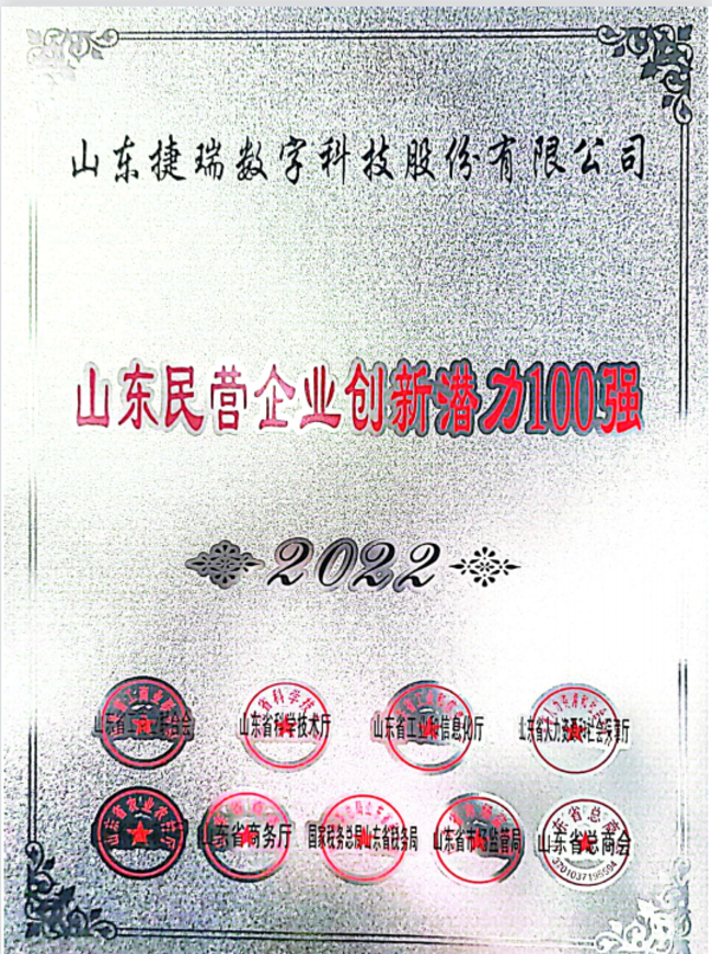 捷瑞數字憑借在工業互聯網領域的創新實踐,成功入圍山東民營企業創新100強,成為百強榜單中唯一一家為制造行業提供工業互聯網服務的科技創新型企業。