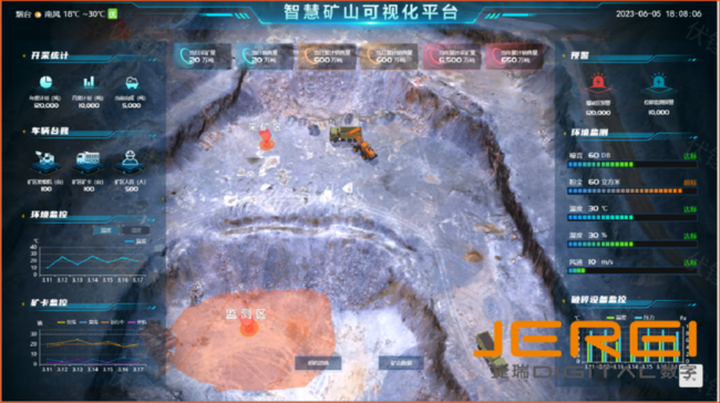智慧礦山系統面向生產現場管理,以數字孿生為驅動,對礦山環境、地形、設備、人員、路網等各要素態勢進行數字映射,還原生產現場。同時,系統還可結合前端智能感知設備數據,集成現有系統數據,實現對礦山生產、設備、人員、運輸、環境、能耗等生產現場全要素的綜合監控,對異常事件進行實時報警,實現一圖覽全“礦”的效果,從而提升管理效率,降低安全風險。
