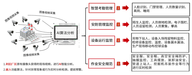 安全管控中心依托AI視覺分析技術,對安全生產管理進行違規操作監測和智能預警。中心涵蓋了多種應用,利舊廠區原有攝像頭,涉及智慧考勤、安防管理監控、設備運行監管、作業安全規范四大類別。