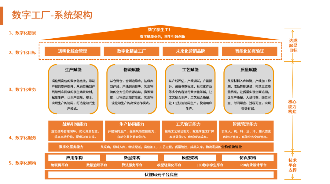 安總首先介紹了基于伏鋰碼云平臺搭建的數字孿生工廠系統。該系統以三維場景為基礎,融合人工智能、算法平臺、大數據、5G等先進技術,搭建包含數據架構、模型架構、仿真架構、應用架構的數字孿生完整體系,通過采集人、機、料、法、環、測六要素數據,實現全要素全生命周期管理,建設以數字孿生驅動的數字工廠。以數字化精益工廠推進思路為牽引,以引領級數字孿生工廠為目標,打造一個“會表達、能思考、知判斷、輔決策”的數字孿生工廠,助力企業數字化、智能化、未來化建設。